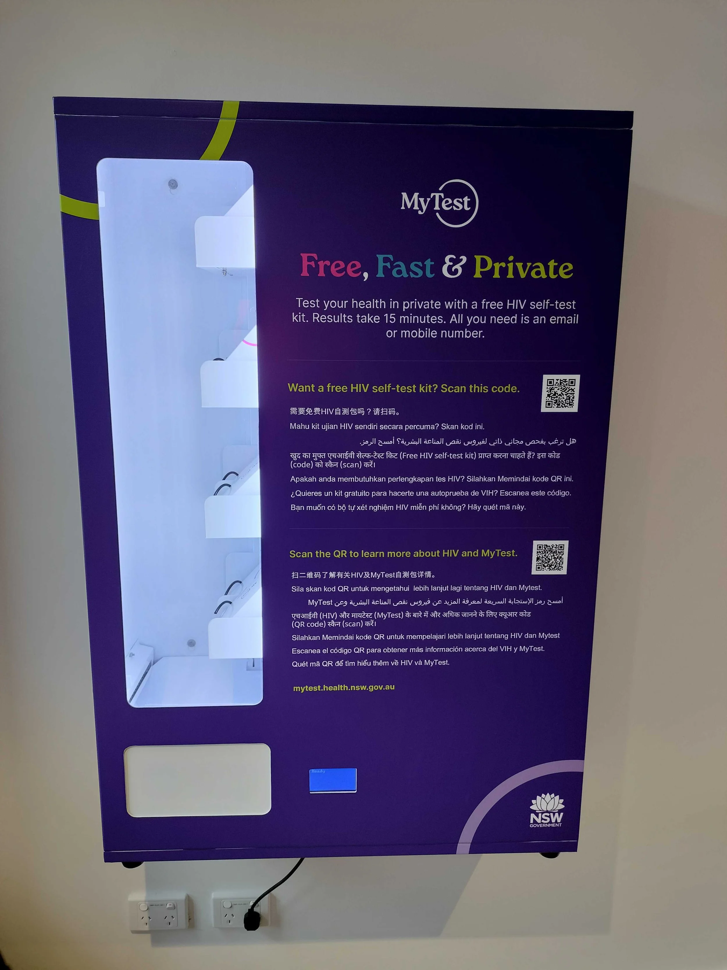 - Get a free HIV self-test from a MyTest vending machine - https://endinghiv.org.au/blog/get-a-free-hiv-self-test-from-a-mytest-vending-machine/